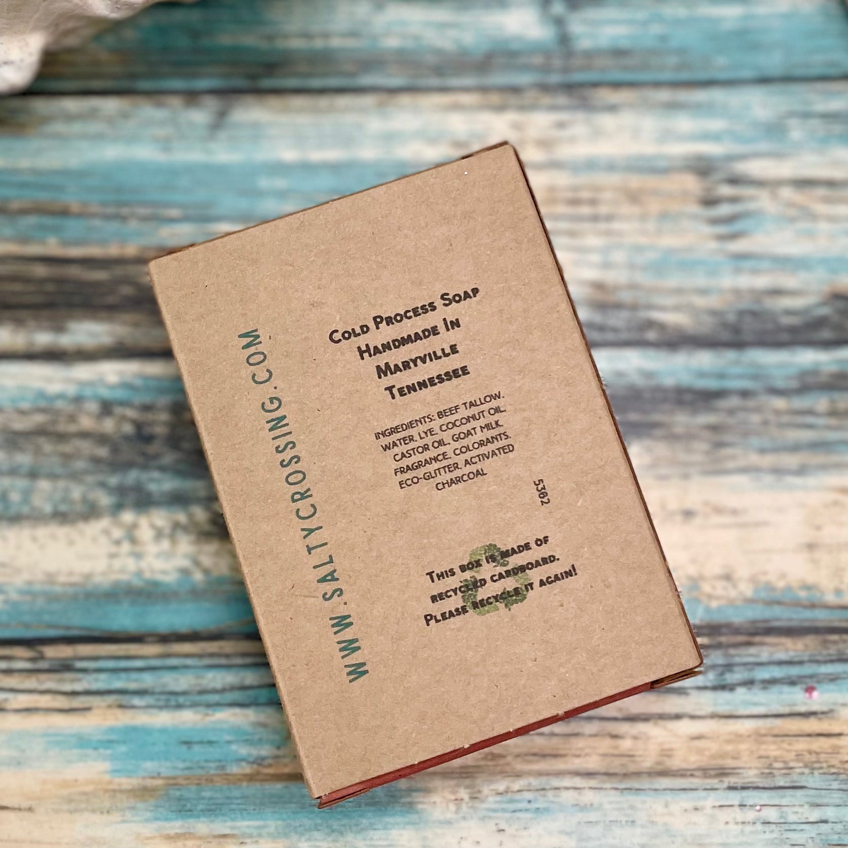 - Ingredients: beef tallow, water, lye, coconut oil, castor oil, goat milk, fragrance, colorants, eco-glitter, activated charcoal
